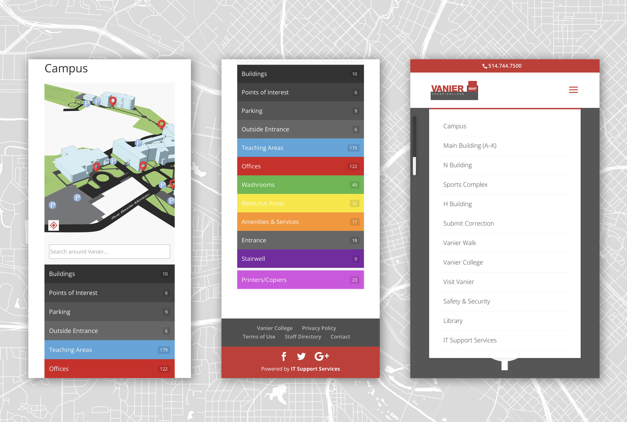 In the header, the drop-own menu gives 5 mapping options (Campus, Main Building (A-K), N Building, Sports Complex, and H Building), 5 links to other Vanier pages (Submit Correction, Vanier College, Visit Vanier, Safety and Security, Library, and IT Support Services, etc.) and a link to Vanier Walk (interesting, but not covered in this report).