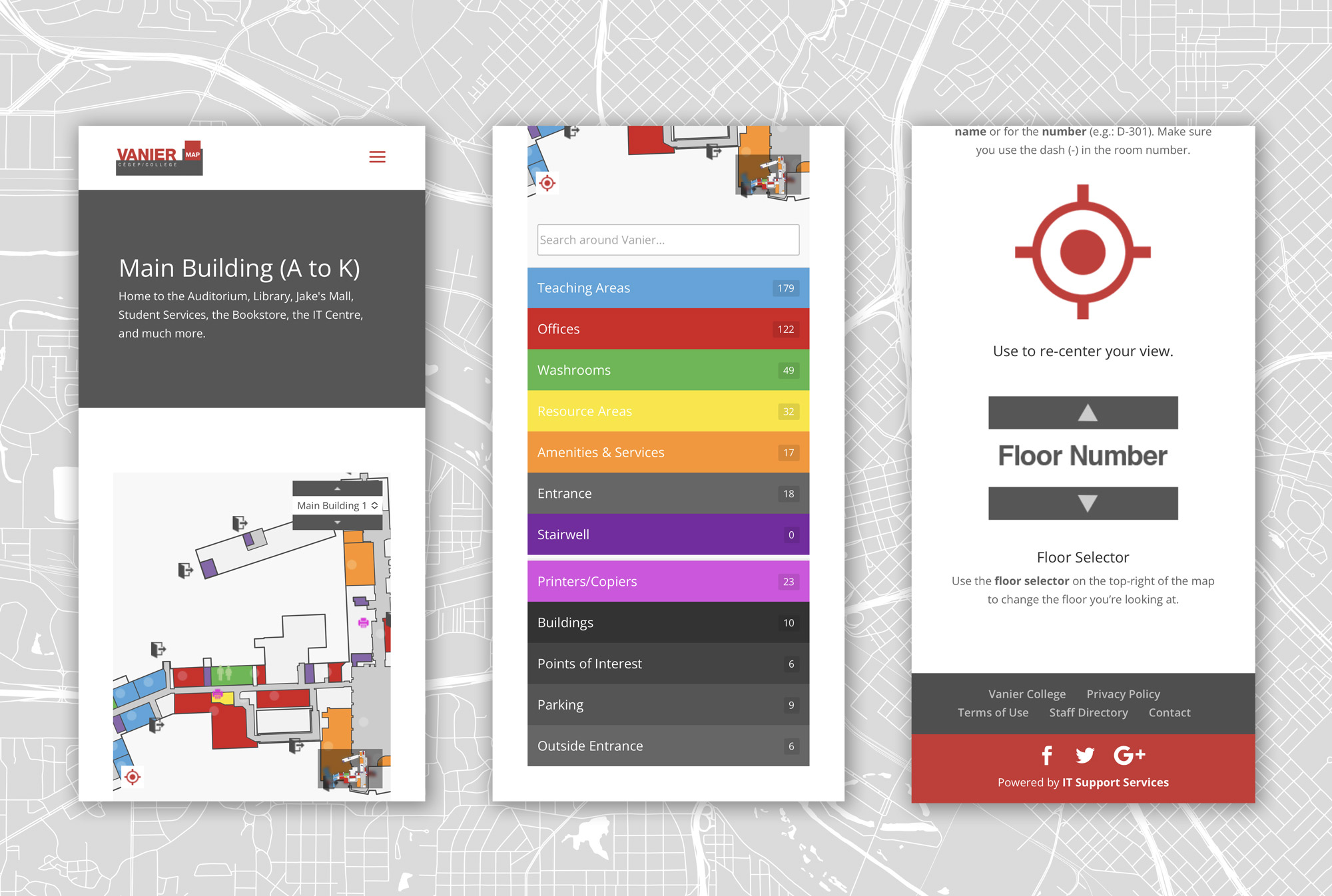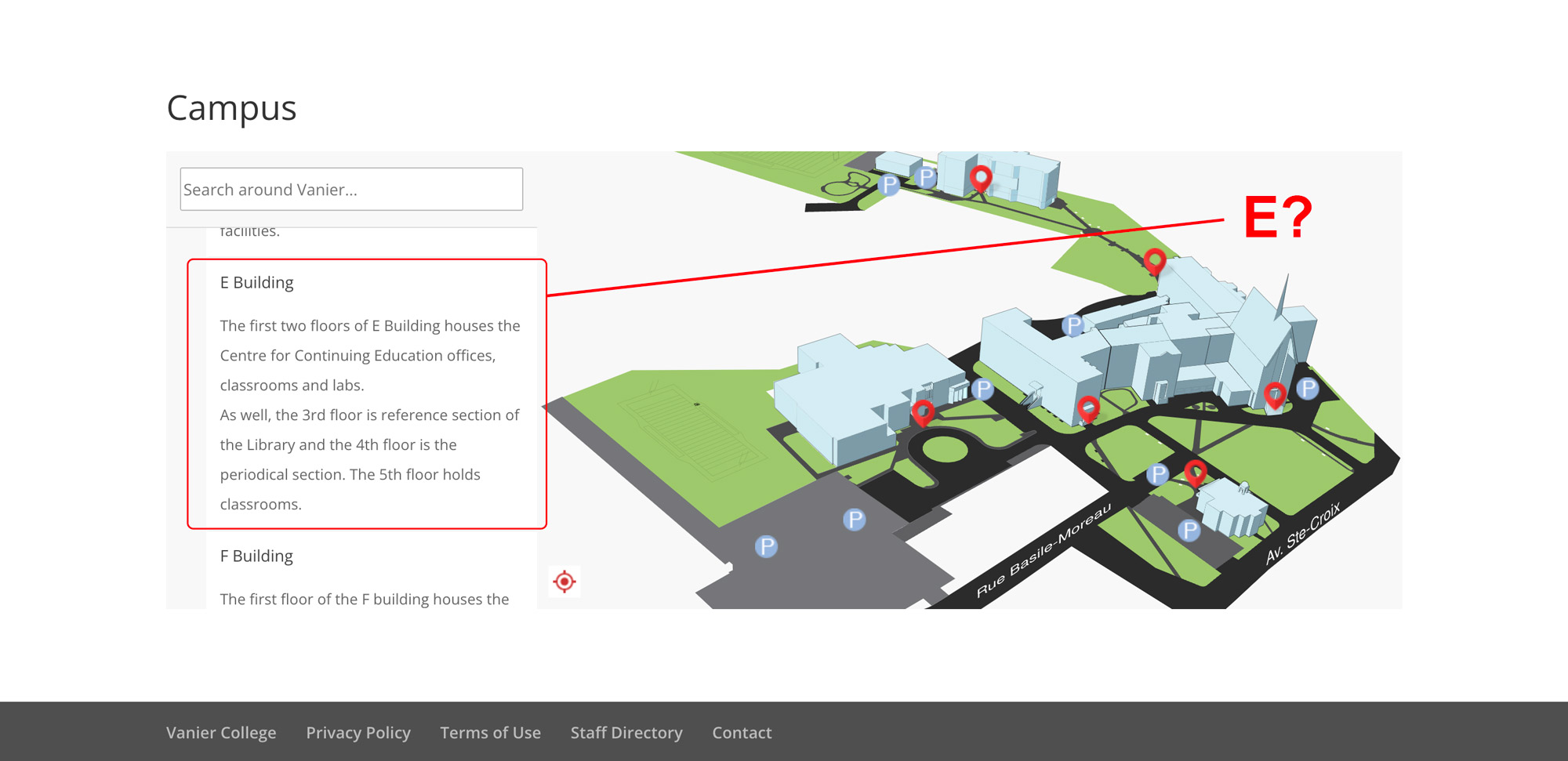 This project examines the Vanier Interactive Map (available at map.vaniercollege.qc.ca) in order to consider its effectiveness as a mapping tool, focusing on the navigation of the landing page.