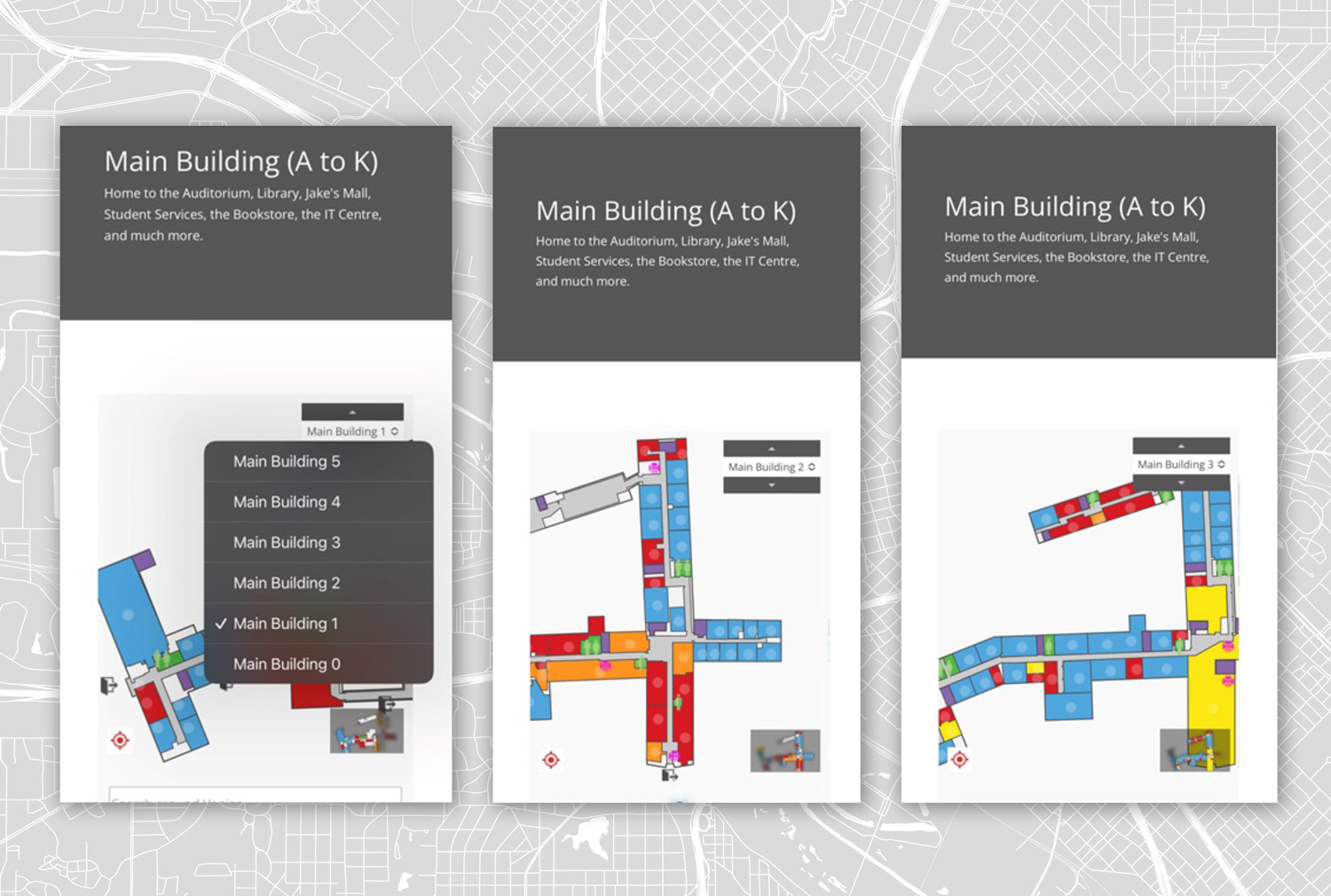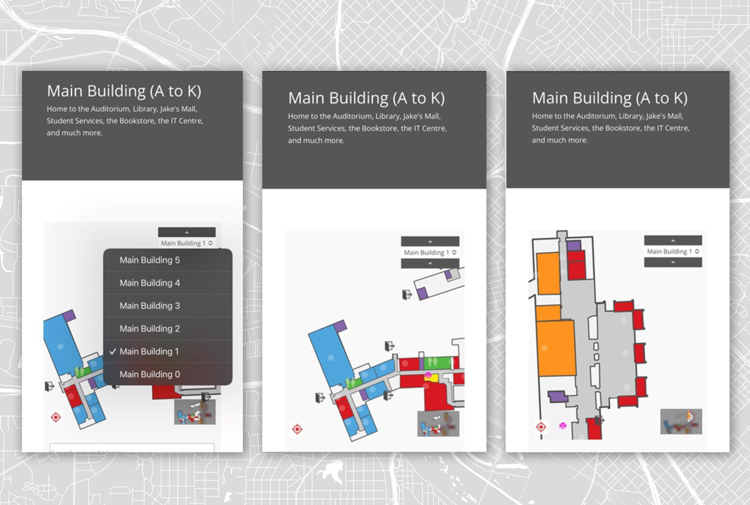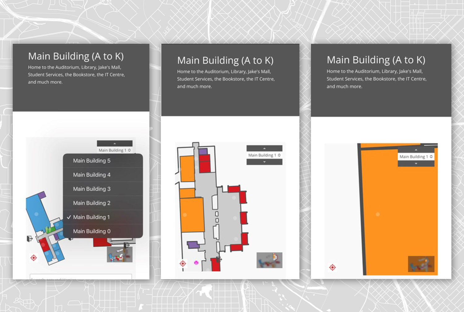 Once on the Main Building page, the user can click in the “legend” map to see a specific building and the floor of the building (Main Building 0-5) will be displayed. However, if the user scrolls to another building, the “legend” map updates to the new building while the Main Building # (0-5) remains the same. If users think that this is the name of the building, it creates confusion.