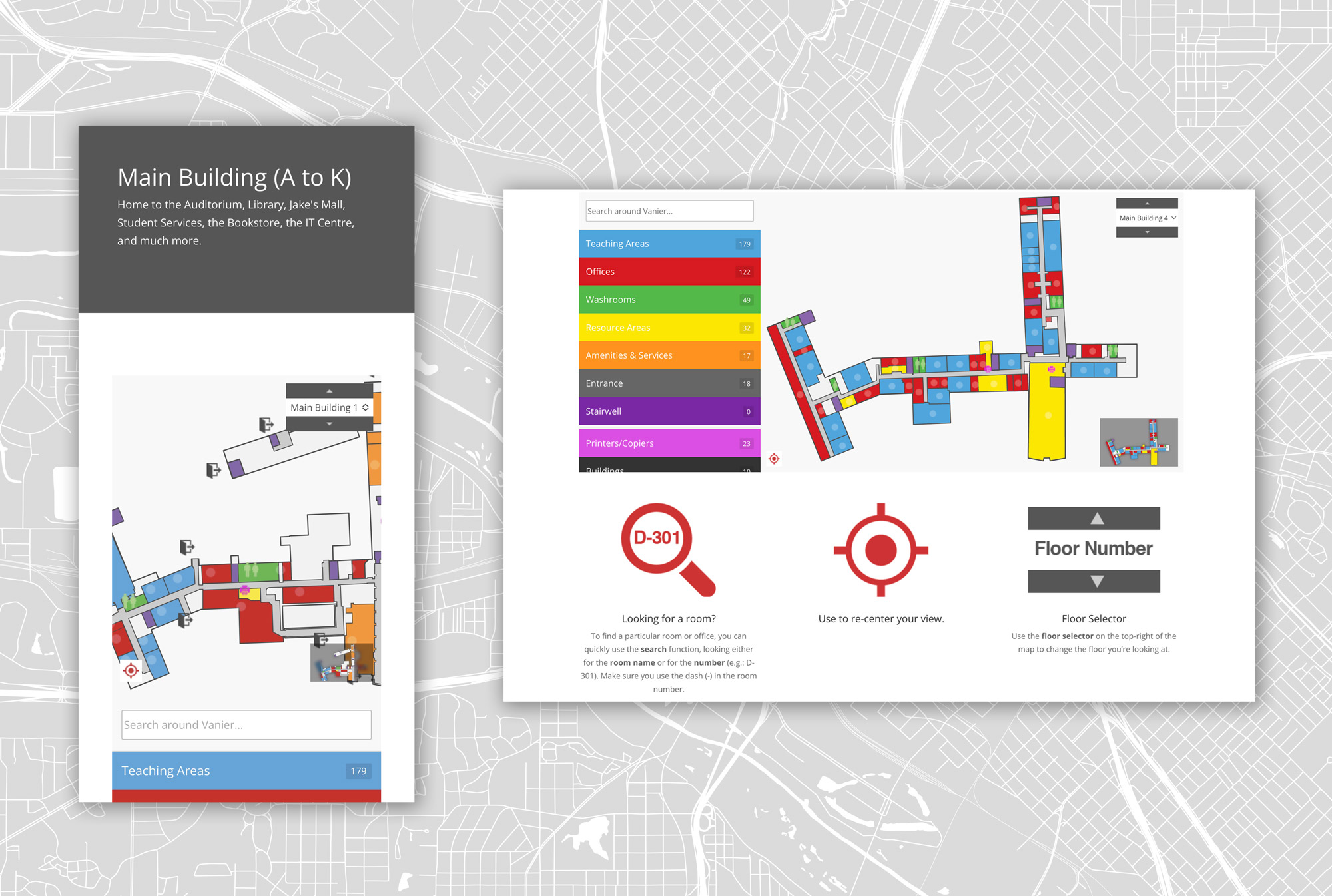 The Vanier Interactive Map is an important tool for students, teachers and visitors to use in order to be comfortable navigating Vanier College. We identified several problems on the landing page, including frustrating navigation, unclear campus models, confusing information and overwhelming visuals.