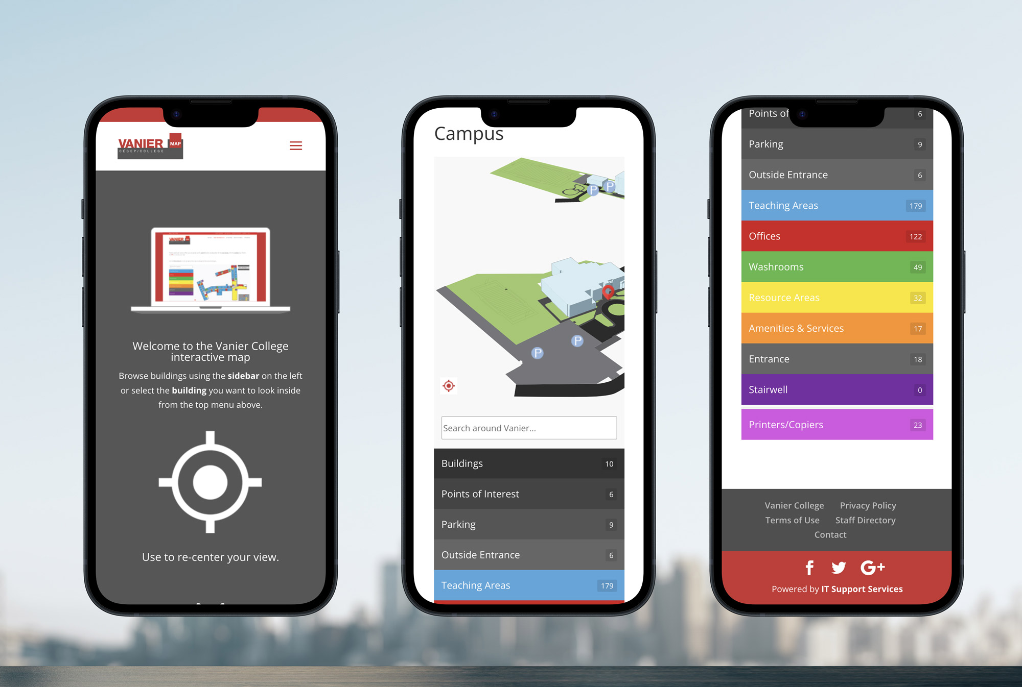 - Vanier Walks: Opens an interactive, photo-realistic map of the green areas surrounding the campus.